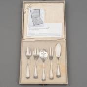 Vijfdelig 2e gehalte zilveren hors d'oeuvreset, bestaande uit: twee dienvorkjes, een sardinevork, een olijflepel en een boterspatel, meester: J.M. van Kempen en Zonen, Voorschoten, circa 1920, gewicht 130 gram