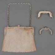 3e gehalte zilveren maliënavondtas, 2e gehalte zilveren beursbeugel en 3e gehalte zilveren beursbeugel met blauw glazen knopje, brutogewicht 267 gram, tas circa 15 × 17 cm