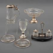 Inktstel op gezwart houten basement, met 2e gehalte zilveren montuur en doppen, glazen pul met 2e gehalte zilveren klep met gravure, kristallen schaal op 2e gehalte zilveren voet met meanderdecor en inscriptie: 'Uit Achting en Vriendschap van de familie Holm', kristallen glas met 2e gehalte zilveren voet met inscriptie '10 juli 1904' en twee geslepen kristallen onderzetters met 2e gehalte zilveren gladde rand, kristallen schaal Ø 17 cm