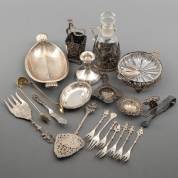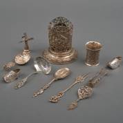 Divers zilverwerk, diverse gehaltes, waaronder: 2e gehalte zilveren theezeef op lekbakje en lorgnet, paar vorkjes in cassette, brutogewicht 633 gram