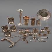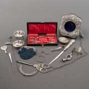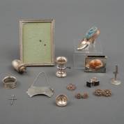 Divers klein zilverwerk, diverse gehaltes, waaronder fotolijst met houten achterzijde en speldenkussen in de vorm van een schoen, punt gegraveerd 'Mar 12 1907', daarbij: onedele manchetten en een golfspelertje, brutogewicht 360 gram, fotomaat 11 × 8 cm