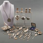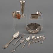 Divers klein zilverwerk, diverse gehaltes, waaronder vijf 2e gehalte zilveren zoutlepeltjes en anjervaasje, gewicht zilver 272 gram, anjervaasje circa 12 × Ø 5 cm