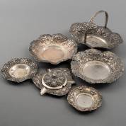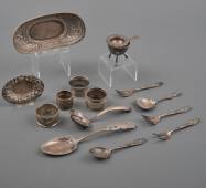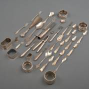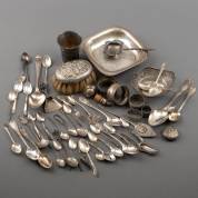 Divers kleinzilver, diverse gehaltes, waaronder: suikermandje, hamergeslagen schaal op voet, vele koffielepeltjes, servetringen, etc. brutogewicht 1250 gram
