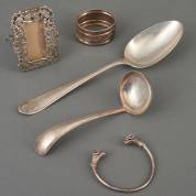 Divers zilverwerk, voornamelijk 2e gehalte: groentedienlepel, sauslepel, servetring, gesp vermaakt tot fotolijstje en spangarmband met ramskoppen, brutogewicht 319 gram, fotolijstje circa 9 × 6 cm