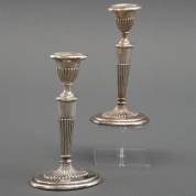 Paar 2e gehalte zilveren kandelaars met gecanneleerde stam op ovale voet, meester: Zilverfabriek Voorschoten, 20e eeuw, brutogewicht 180 gram, hoogte circa 15 cm -één staat uit het lood, deuken in bobèches-