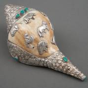 Tibetaanse conchschelp bekleed met zilver, waaronder twaalf diervormige appliques en gezet met vijf cabochongeslepen turkoois, BWZG, brutogewicht 547 gram, circa 8 × 22 × 10 cm