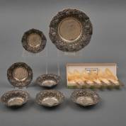 BWZG Djokja kom en zes schaaltjes met gedreven vruchtendecor, gewicht 503 gram, afmetingen kom 3 × Ø 18 cm, daarbij: zes hoornen lepeltjes met BWZG montuurtjes, lengte 12 cm
