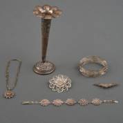 BWZG Djokja anjervaasje, daarbij: enkele zilveren filigrainsieraden, brutogewicht 147 gram, vaasje 15 cm