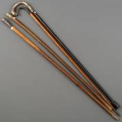 Twee houten wandelstokken met zilveren grepen, wandelstok met witmetalen greep en wandelstok met handgreep van gewei, 85 cm -defecten-