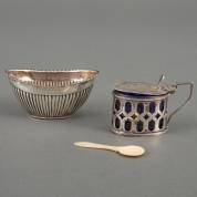 1e gehalte zilveren ajourgezaagd mosterdpotje met blauw glazen binnenwerk, meester: William Aitken, Chester, 1835, en geribd 1e gehalte zilveren zoutschaaltje met geschulpte rand, meester: William Henry Leather, Birmingham, 1896, gewicht zilver 46 gram, bakje circa 4 × 7 × 5 cm -blauw glazen bakje niet origineel-