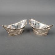 Paar schuitvormige 2e gehalte zilveren bonbonmanden met spijlendecor, afgezet met parelrand, meester J. van der Dussen, 's-Gravenhage, 1904, gewicht 305 gram, 7 × 17 × 9,5 cm -één bodem zit los-