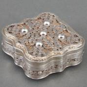 Vierkant 2e gehalte zilveren pepermuntdoosje met filigrain decor en ongegraveerd cartouche, 19e eeuw, gewicht 64 gram, circa 1,8 × 5 × 5 cm