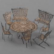 Zilveren filigrain miniaturen: tafel, vier stoelen, twee bankjes en een schommelstoel, gewicht 26 gram, tafel circa 2,5 × Ø 7 cm -gebruikssporen-