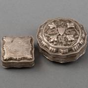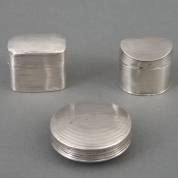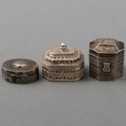 Twee geribde 2e gehalte zilveren lodereindoosjes, 1817 en 1818, en een geribd 2e gehalte zilveren pepermuntdoosje, 1826, totaal gewicht 69 gram, lodereindoosjes circa 3 × 3 × 2,5 cm -lichte gebruikssporen-