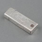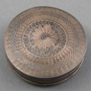2e gehalte zilveren tondeldoosje met gegraveerd decor, brutogewicht 22 gram, circa 6,5 × 2 × 1 cm -gebruikssporen-