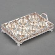 Zilveren miniatuur: dienblad met zes kop-en-schotels, meester: Johannes Arnoldus van Geffen, Amsterdam, 1791, gewicht 50 gram, circa 2 × 6,5 × 4,5 cm