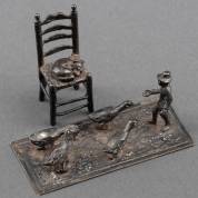 Twee 2e gehalte zilveren miniaturen: man met ganzen, en kat slapend op stoel, de laatste meester, W. Spel & J.F. Schiffel, Hoorn, gewicht 27 gram
