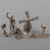 Zes zilveren miniaturen, diverse gehaltes: stierenvechter, molen, ijshockeyspeler, parapluventer, hoepelaar en man met loopfiets, gewicht 115 gram, stierenvechter 7,5 × 3 cm