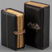 Twee kerkboekjes (het Nieuwe Testament, de Psalmen en de Catechismus). 12mo. Lederen bandjes, goud op snee.1) met 14kt gouden klampsluiting. 2) met versierde zilveren overslagsluiting