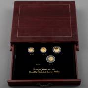 Incomplete muntenset Koningin Juliana 1948-1980, Koninklijk Nederlands Goud van Weleer, met gouden 50-gulden, 1979, gouden 100-gulden, gouden 200-gulden, 1976, en gouden 300-gulden 1980, in houten cassette met lade voor vijf munten -200-gulden, 1977 ontbreekt in de set-