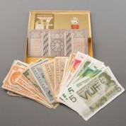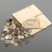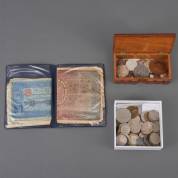Divers oud muntgeld, waaronder drie grote zilveren rijksdaalders, en mapje met oude bankbiljetten, voornamelijk Duitse Marken