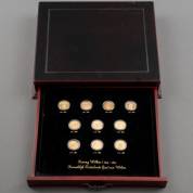 Muntenset met tien gouden tientjes, Willem III, 1849-1890, Koninklijke Goud van Weleer; gouden tientje 1875, 1876,1877, 1879, 1880, 1885, 1886, 1887, 1888, en 1889 in houten cassette met lade