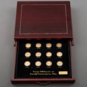 Muntenset met elf gouden tientjes en een gouden vijfje, Wilhelmina 1890-1948, Koninklijke Goud van Weleer; gouden tientje 1897, 1898,1911, 1912, 1913, 1917, 1925, 1926, 1927,1932, en 1933, en gouden vijfje, 1912, in houten cassette met lade