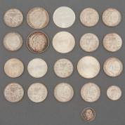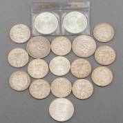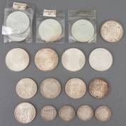 Een grote zilveren Nederlandse rijksdaalder, Willem III, 1860, en vier 10-gulden, drie Nederland Herrijst, 1970, en één Juliana Regina 1973, daarbij: dertien zilveren Nederlandse rijksdaalders, Juliana, circa 1960, gewicht 289 gram
