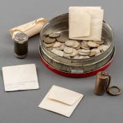 Blik met dubbeltjes en kwartjes, circa 1945