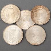 Acht zilveren 10-gulden munten, Juliana, 1970-1973, zes zilveren 10-gulden munten, Beatrix, 1994-1997, vier zilveren 50-gulden munten, vijf zilveren rijksdaalders, Juliana, 1959-1961, totaalgewicht 464 gram