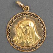 18kt rosé- en geelgouden hanger met geciseleerde beeltenis van Maria, gewicht 4,0 gram, Ø 3 cm