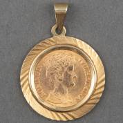 Gouden vijfje, Wilhelmina, 1912, in 14kt gouden montuur aan plaatoog, gewicht 5,6 gram, Ø 2,5 cm