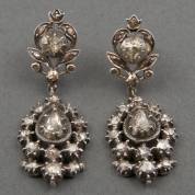 2e gehalte zilveren oorhangers aan 14kt gouden steker, elk gezet met 23 roosdiamanten, brutogewicht 13,8 gram, lengte circa 4,5 cm