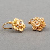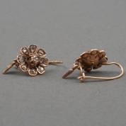Paar 14kt gouden bloemvormige oorhangers elk gezet met negen roosdiamanten en klein pampeltje met roosdiamantje, brutogewicht 3,2 gram, lengte circa 2 cm -één pampel mist roosdiamantje-