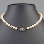 Parelcollier van gecultiveerde parels aan 14kt gouden en zilveren sluiting gezet met een entourage van roosdiamanten, lengte circa 42 cm