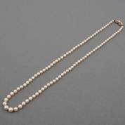 En chûte geknoopt parelcollier van gecultiveerde parels, aan 14kt witgouden parelslot gezet met pareltje, lengte circa 49 cm
