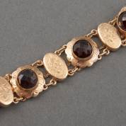 14kt gouden bootjesarmband gezet met zeven ronde gefacetteerde granaten, afgewisseld met ovale schakels met gegraveerd bloemmotief, brutogewicht 19,4 gram, lengte circa 17 cm
