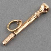 14kt gouden horlogesleutel aan hangoog, brutogewicht 2,0 gram, lengte circa 3,5 cm