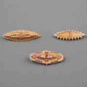 Drie BWGG markiesvormige, Victoriaanse broches, waarvan één gezet met zaadpareltjes en rood kristal, brutogewicht 11,8 gram, broche met pareltjes circa 4 × 2 cm