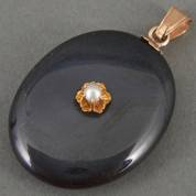 Ovaal onyx rouwmedaillon met verso een compartiment en aan de voorzijde gezet met een pareltje in gouden bloemzetting, circa 5,5 × 3,5 cm