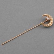 14kt gouden speld met sikkelmaan gezet met zaadpareltjes en roosdiamant, brutogewicht 2,0 gram, lengte circa 6,5 cm