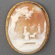 14kt gouden hanger gezet met ovale schelpcamee: scène van dame met hond, brutogewicht 9,8 gram, circa 5 x 4 cm