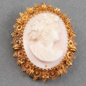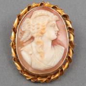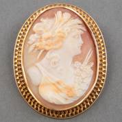 14kt gouden broche gezet met ovale schelpcamee: damesportret en profil, brutogewicht 14,2 gram, circa 4,5 x 3 cm