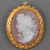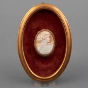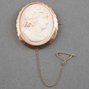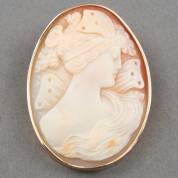 BWGG broche, ook als hanger te dragen, gezet met ovale schelpcamee: damesportret en profil, brutogewicht 7,8 gram, circa 4 × 3 cm
