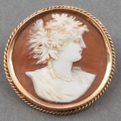 14kt gouden broche, ook als hanger te dragen, gezet met ronde schelpcamee: damesportret en profil, brutogewicht 7,2 gram, circa Ø 3 cm