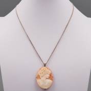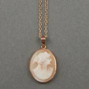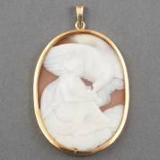 14kt gouden hanger gezet met ovale schelpcamee: dame met duif, brutogewicht 11,0 gram, circa 4,5 × 3,5 cm