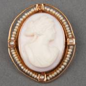 BWGG cameebroche (gemerkt 10kt), ook als hanger te dragen, schelpcamee met damesportret en profil, omgeven door zaadpareltjes, brutogewicht 6,4 gram, circa 3,5 × 3 cm