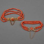 Twee driestrengs bloedkoralen armbandjes aan 14kt gouden bakslot met veiligheidsketting, lengte circa 18 en 19,5 cm