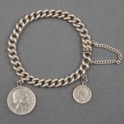 2e gehalte zilveren gourmet schakelarmband met bakslot en veiligheidsketting, waaraan een halve zilveren gulden, 1861 en een zilveren 10-cent, 1939, gewicht 32,2 gram, lengte circa 19,5 cm