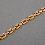 14kt gouden schakelarmband van rechte gesatineerde schakels, aan bakslot met twee veiligheidsachtjes, gewicht 13,6 gram, lengte circa 19,5 cm